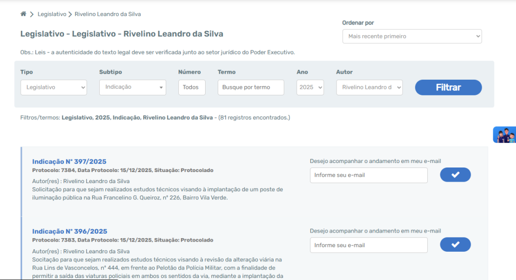 Por outro lado, o vereador se destaca como um dos mais ativos em indicações, ultrapassando a marca de 80 documentos apresentados no período analisado. Caso esse fator tivesse maior peso, o desempenho final não seria tão baixo.
