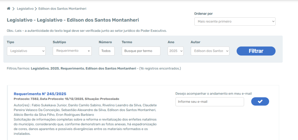 Como presidente da Câmara Municipal, grande parte de sua atuação está voltada à condução administrativa da Casa: sessões, pautas, articulação política e gestão interna. Esse fator explica, mas não altera o resultado técnico do índice.